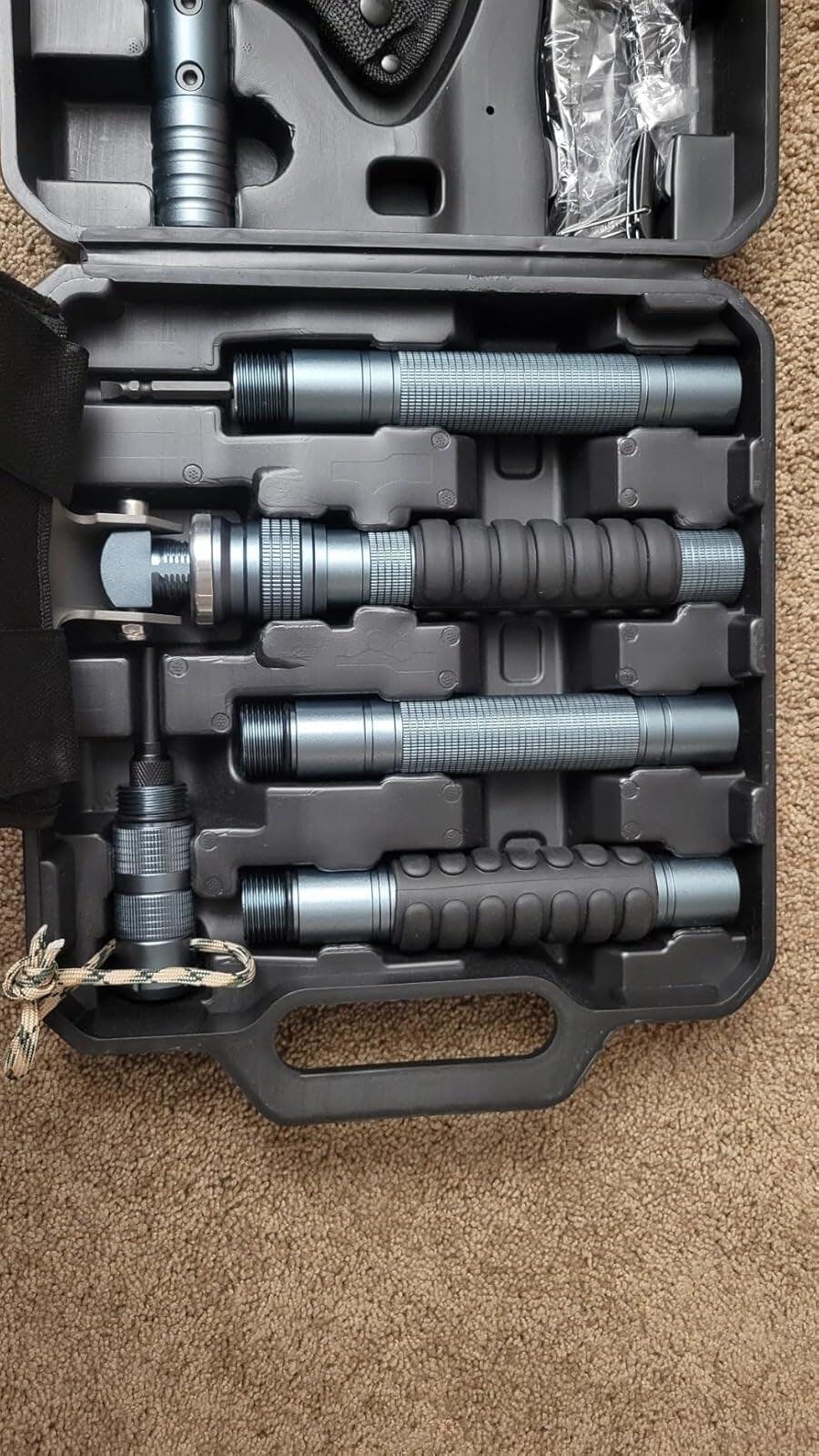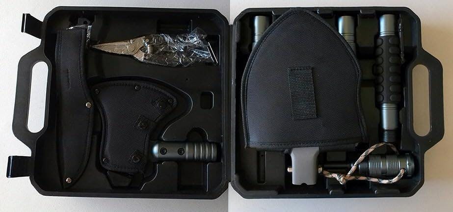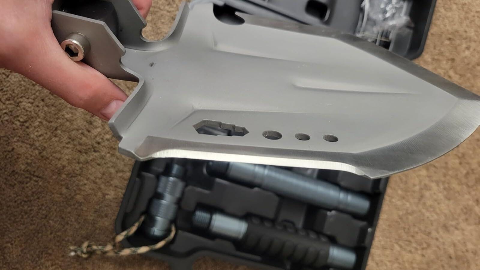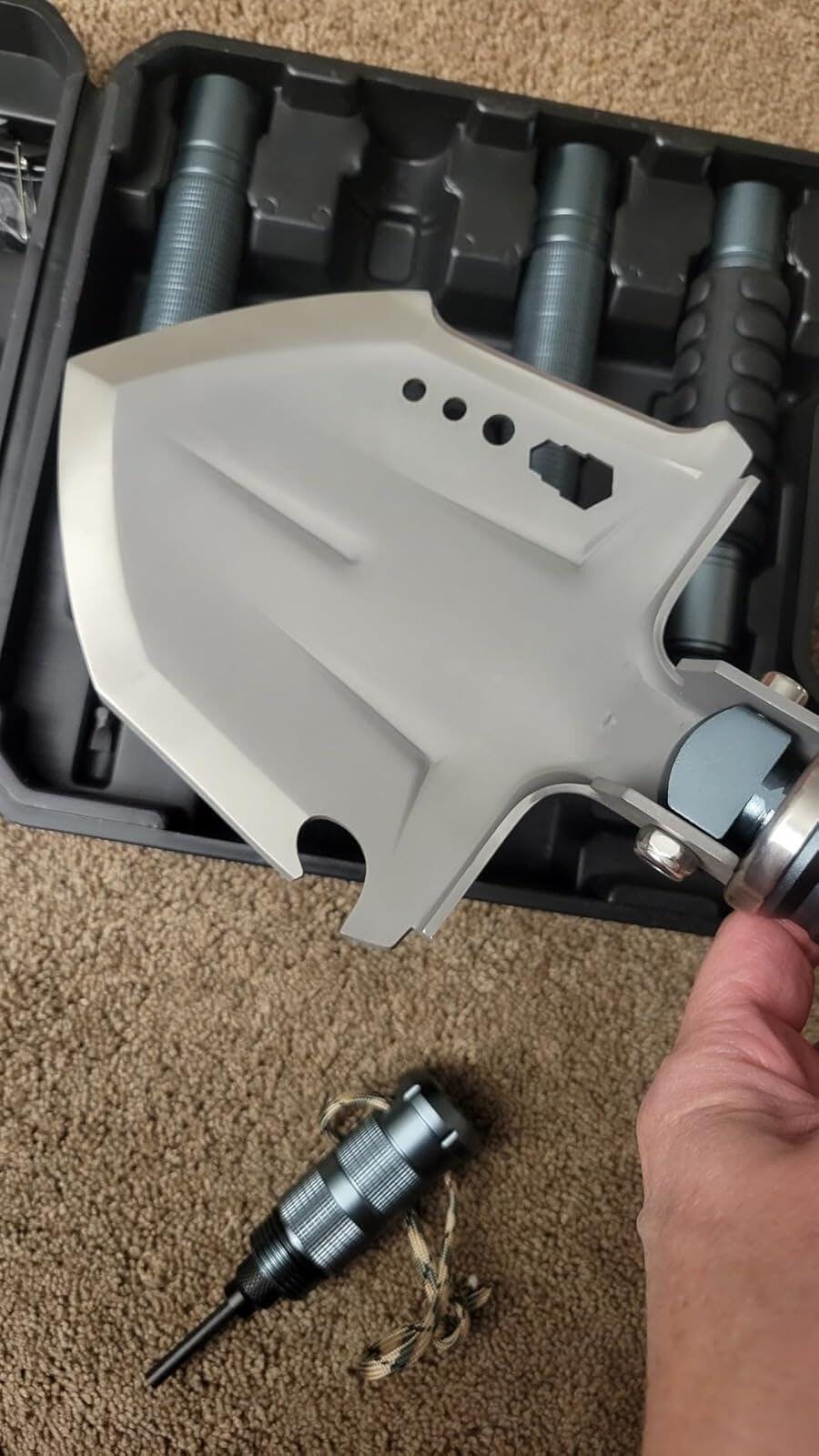 This survival shovel kit is pretty impressive. It comes in a nice, heavy duty plastic storage box. The axe head and shovel attachment have their own sheaths.There is also a knife and scissors/shears for cutting as well.The different sections have rubber foam pads that help with grip but they also spin around. That is not so good. The materials all feel heavy duty and the locking mechanism spins down the screw threads into place. I wanted a shovel that did not have a sharp glass breaker on the end since I grab the end when digging.This features 4 sections that make the shovel long enough for a 6ft person. Some shovels are too short when assembled.The axe attachment is sharp and features a flat end of pounding.The shovel is multi function so it has a sharper blade edge and inserts for opening things. Not sure how useful that is, but as a shovel, it works well.The only item I would prefer is a knife blade attachment to make it into a harpoon for spearing fish. The included screwdriver set is pretty limited use in survival.However, overall, overall, the quality of material, and the completeness, this is one of the better sets out there and can help you deal with most if not all of your needs.
