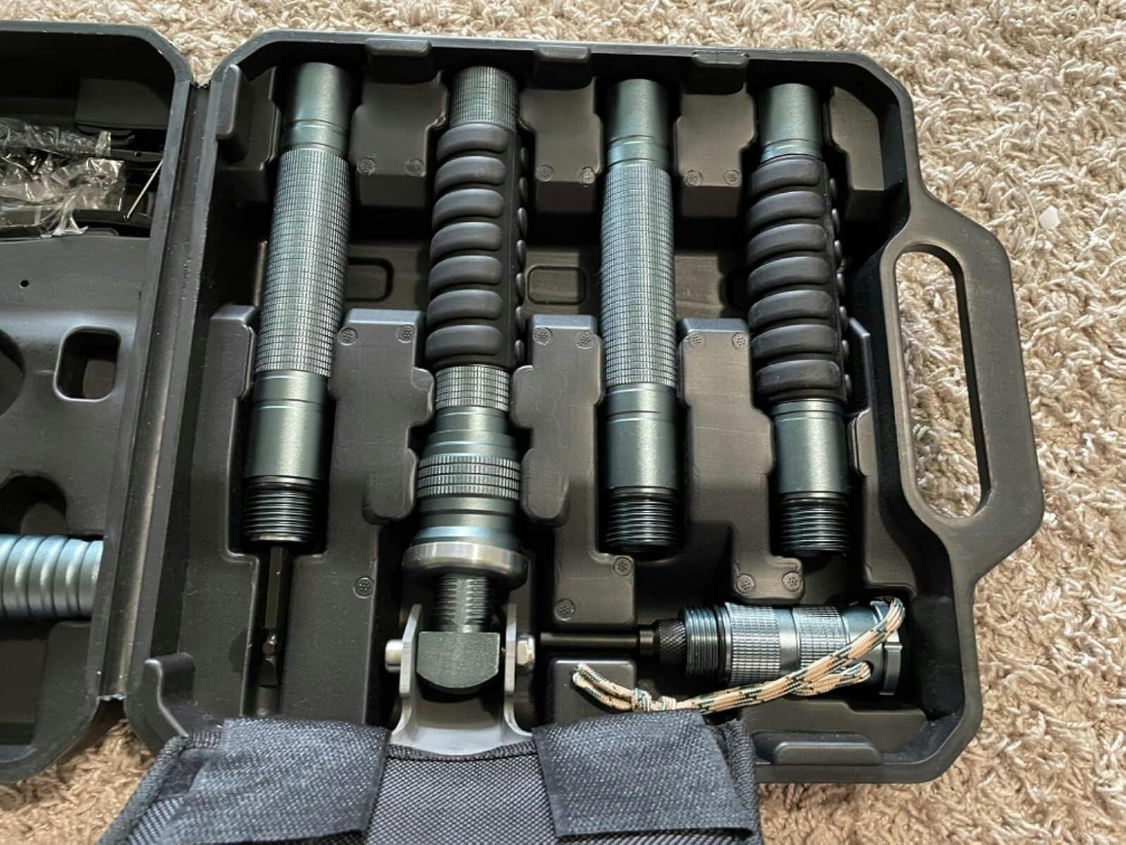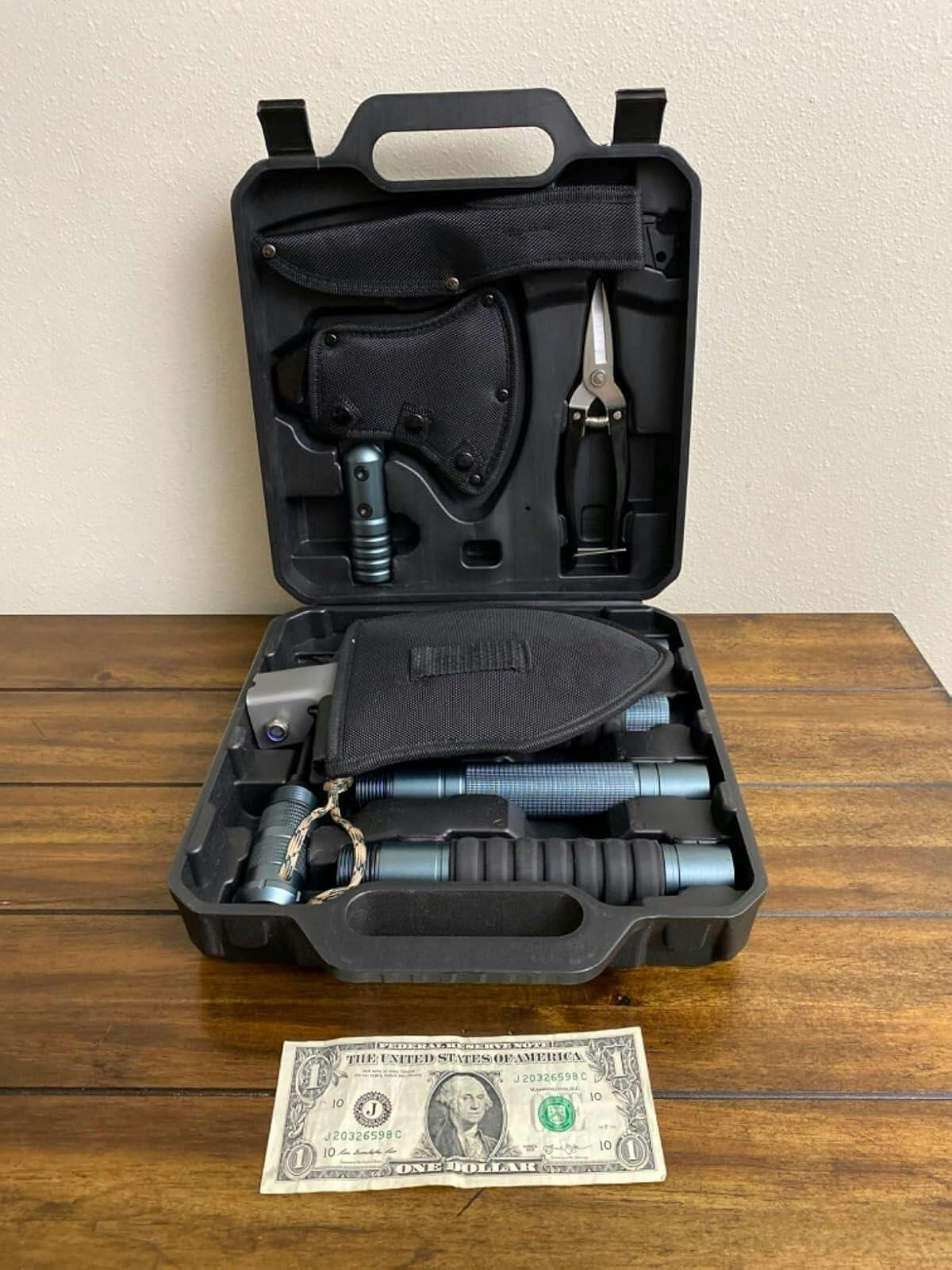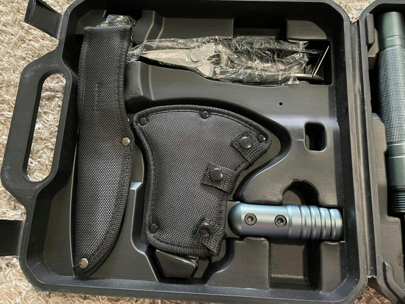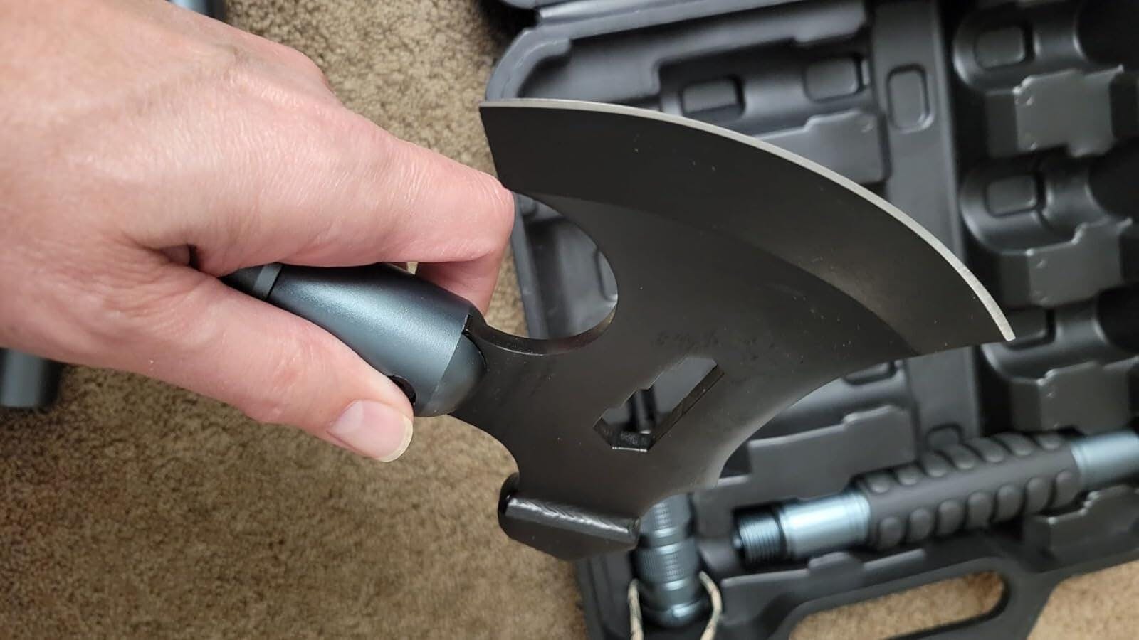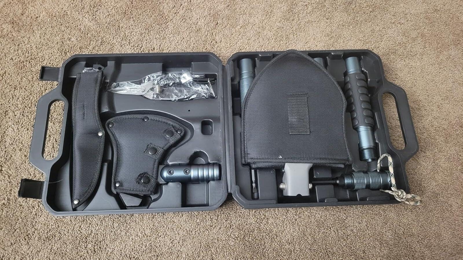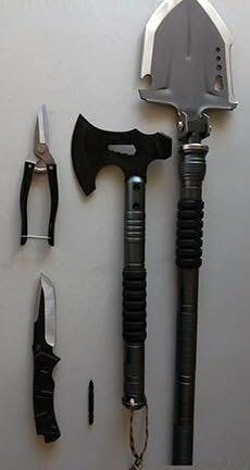 The Good:-Multifunctional survival toolkit-Sturdy stainless and carbon steel-Comes with knife, axe and shovel protective sheath-Foldable and stores in hard plastic case-Non slip gripsThe Bad:-No instructional manualThe Bottom Line:This camping toolkit comes with an axe, shovel, knife, and extension poles. The kit comes in a sturdy plast case and is easy to use and store. The extension poles make the shovel convenient to use. The only negative is that there is no instruction manual but it's pretty easy to figure out. Overall, I would recommend this kit for anyone that likes camping or just outdoor activities.